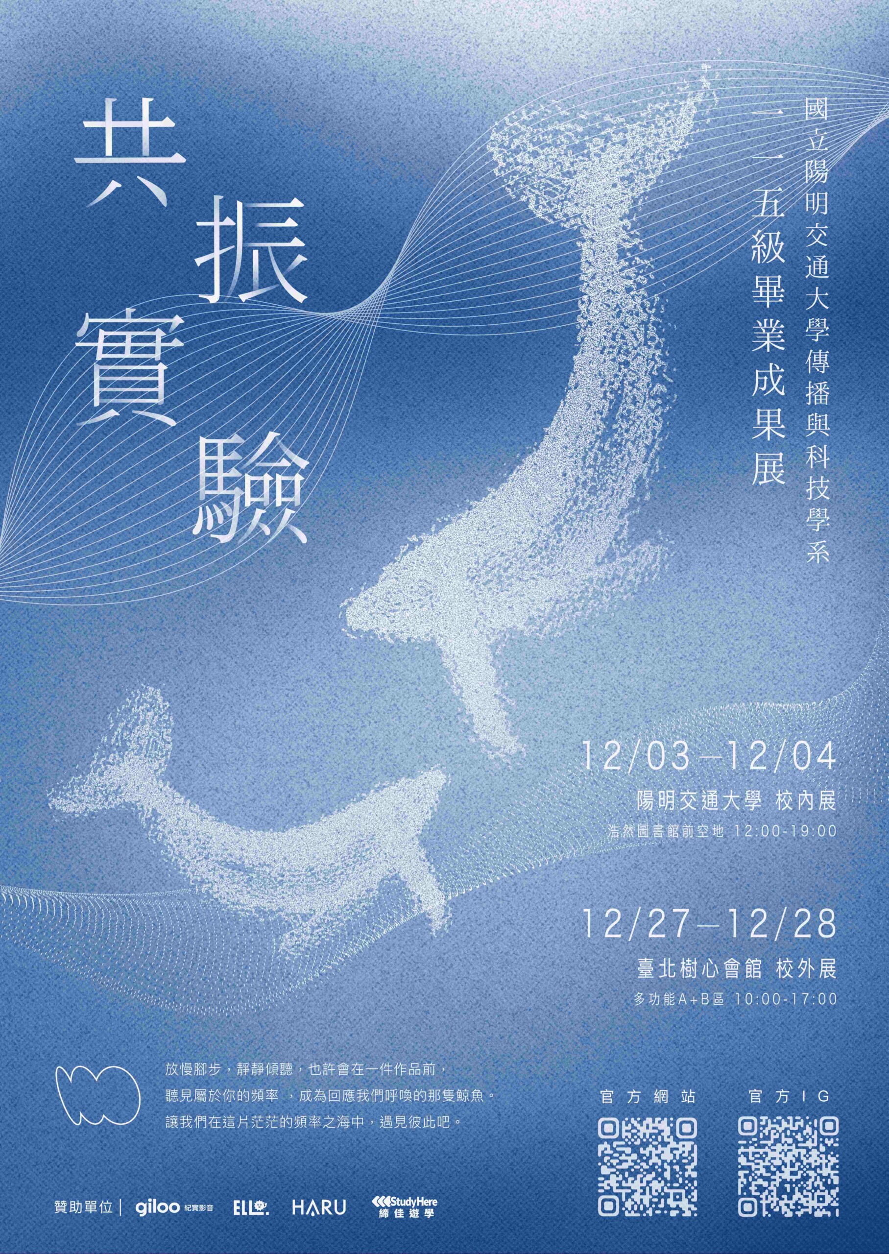 國立陽明交通大學傳播與科技學系畢業展覽將於12/3(三)、12/4(四)在校園內浩然圖書館前的大草皮展出。今年以「共振實驗」為主題,比喻每組作品如同特殊頻率的鯨魚,期望透過和觀者互動的過程,找到彼此共振的頻率,將作品背後的理念完整呈現。本屆校內展近年來首次移至戶外,設計如園遊會的擺攤形式,讓作品能與觀者更直接交流,並設計集章活動增添參與趣味。